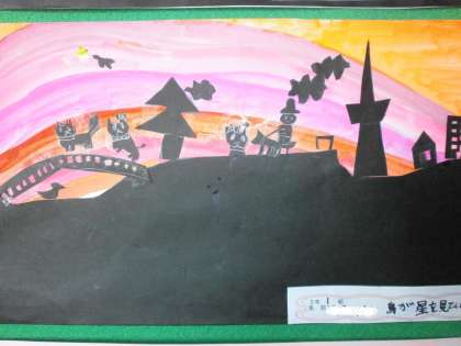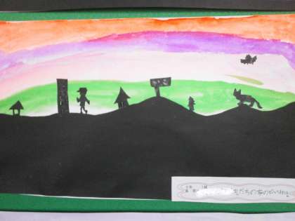 3年生が図工の時間に「夕焼け小焼け」の作品を作りました。導入部分を図工の先生が行い、陰になる黒い部分はそれぞれ学級の先生が指導して仕上げました。雰囲気がよく出ている素敵な作品が多いです。