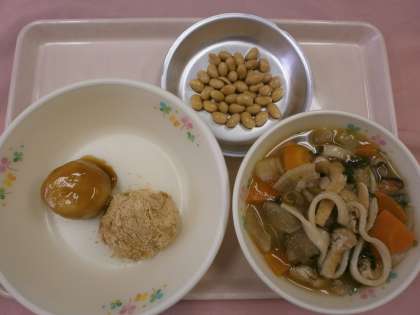 きな粉とみたらしの月見団子と大豆ゆで甘く煮た献立です。