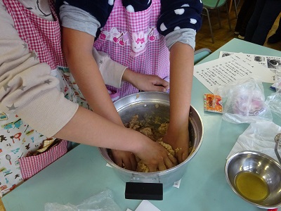 土曜日にサタデースクールがあり、みそ作りを行いました。事前に大豆をゆでておき、鍋に入れておきます。子供たちは、大豆をつぶすところからスタートしました。大豆にはつぶすと、粘り気があり、子供たちは「重い!」と言っていました。豆全体がつぶれたら、こうじと塩を混ぜ合わせ、大豆の中に入れてこねていきます。