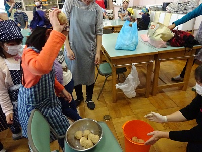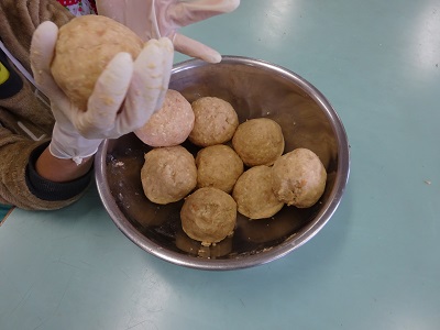こねたら、野球ボールほどの大きさにをいくつか作ります。そして、そのボールを保存容器の中に打ちつけていきます。外れて床に落ちないかドキドキしながら、やっていました(^◇^)貴重な体験ができましたね!