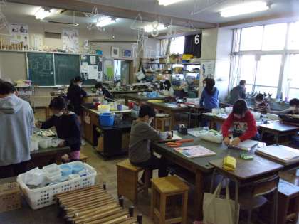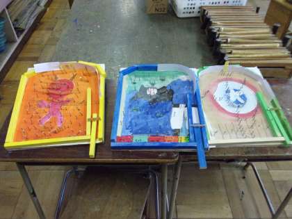 ビー玉が転がり落ちる迷路を釘の位置やデザインを考えながら作成しました。