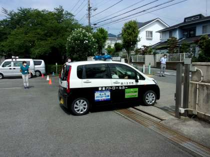 今日は5年生の代表者の児童が「はちおうじキッズパトロール隊」として、青パトに乗って地域の方々と一緒に防犯の呼びかけを行いました。