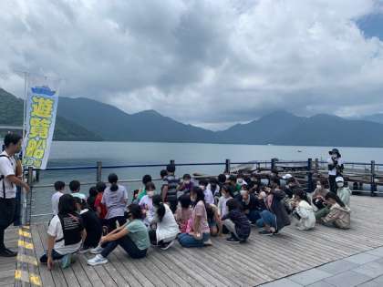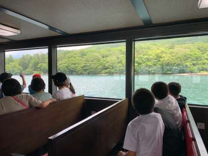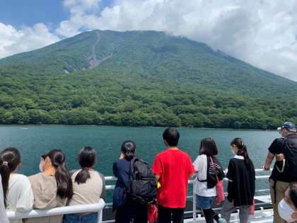 遊覧船に乗りました。雄大にそびえ立つ男体山を間近に見ながら自然を満喫しています。