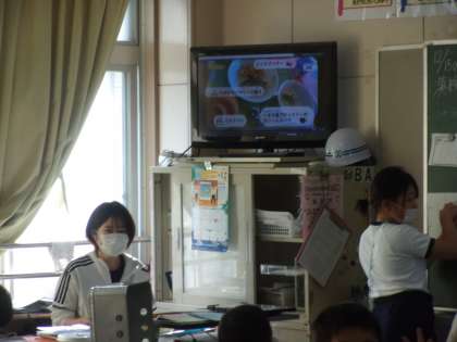 給食の配膳のための見本をいつでも見られて、より分かりやすく伝えるために、本校の栄養士が考えて、教室のテレビ画面でも見られるようにしました。