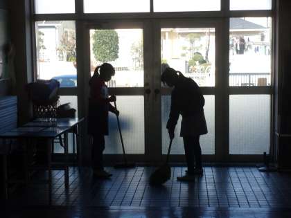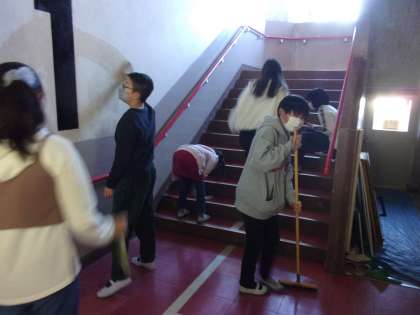 掃除の時間の様子です。廊下や階段、玄関をきれいにしています。みんなで協力して掃除をしています。