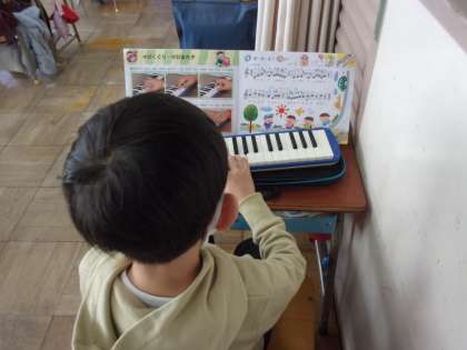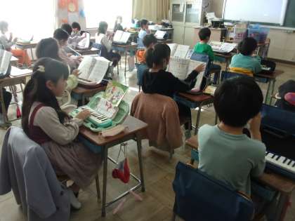 2年生の音楽「いろいろながっきの音をさがそう」の学習の様子です。みんなで音を合わせながら鍵盤ハーモニカで曲を演奏しています。