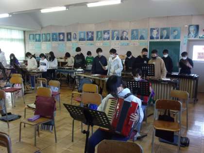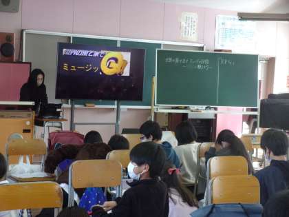 「世界の果てまでミュージッQ」としてインドネシアの音楽「ケチャ」の学習をしました。映像で見た後は「ケチャ」のリズムを実際に体験してみました。「ケチャ」の学習後は合奏の練習をしました。