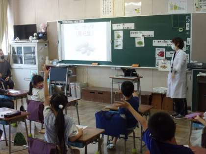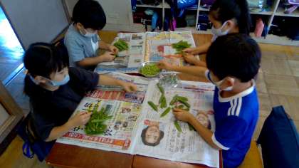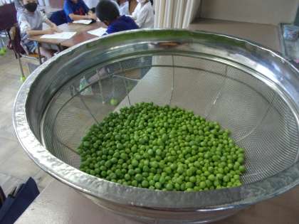 昨日の雨もあがり、今日は晴天の空模様です。食育の一環として2年生がグリーンピースのさやむき体験をしました。栄養士の先生の話を聞いた後、グリーンピースのさやむきをしました。給食の献立の食材がどのように料理されるのかを体験を通して学びました。
