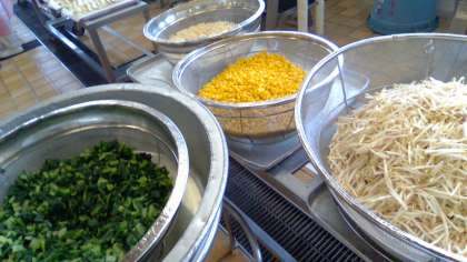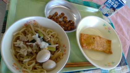 給食では、小松菜やたけのこ、もやし、コーン