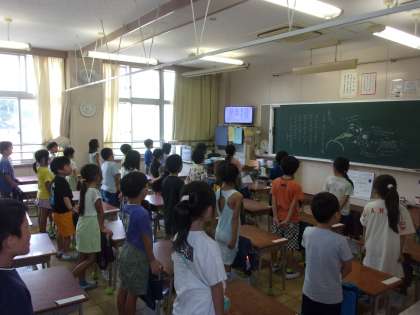 今朝は1学期の終業式をテレビ放送で実施しました3年生の児童が1学期に頑張ったことの発表を代表で行いました。最後に校歌を元気いっぱい歌いました。終業式が終わった後は生活指導担当から夏休みの生活についての話がありました。安全に健康で有意義な夏休みを過ごしてほしいと思います。