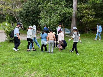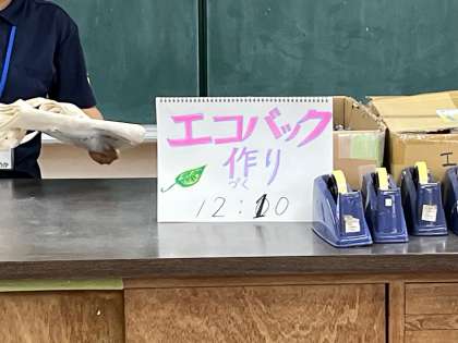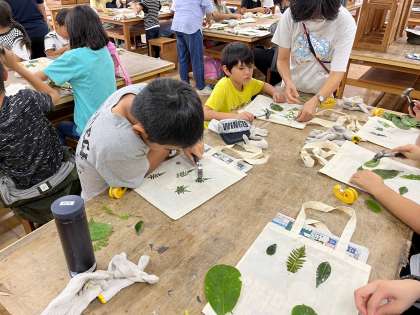 昼食の後はエコバック作りをしました。宿舎の前にある庭で葉っぱを拾い、その葉っぱをデザインにエコバックを作りました。