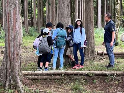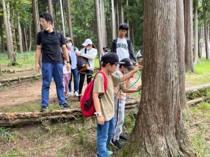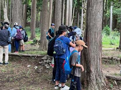 自然発見ゲームの最後は聴診器で木の中に流れる水の音を聞きました。