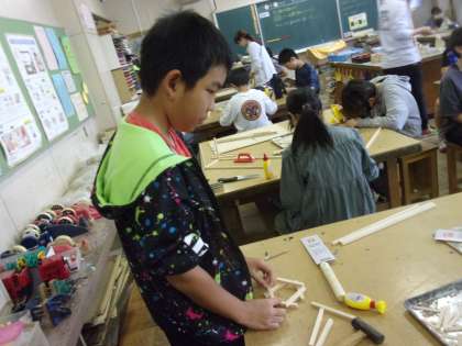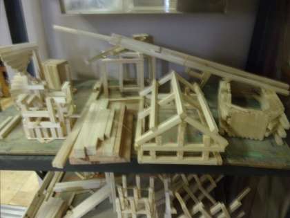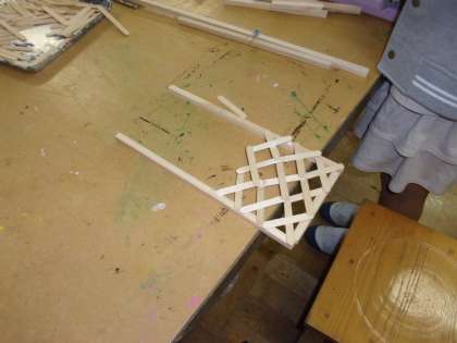木材を幾何学的に組み合わせてタワーを作ります。木の棒をどのように組み合わせれば見た目も美しくなるのか考えながら作っています。