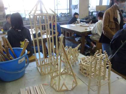 木の棒の組み合わせ方を考えて、タワーを作っています。様々な形のタワーに仕上がっています。