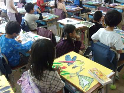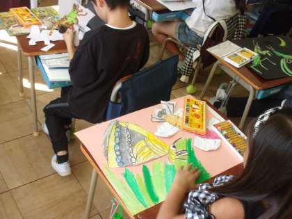 虫を描いて、切り、画用紙に貼り、それぞれの「虫ムシランド」を作りました。