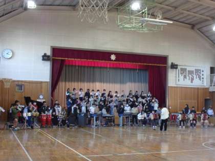 体育館に楽器を移動して、明日の5年生の保護者の方への音楽発表に向けて、仕上げの練習をしています。体育館から校舎の方まで合奏練習の音が聞こえてきます。