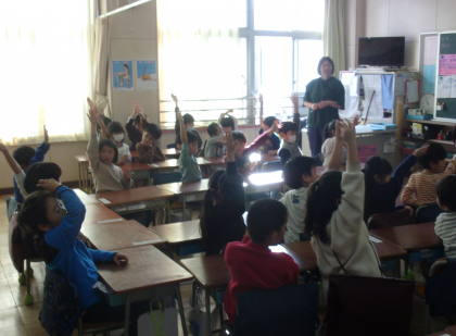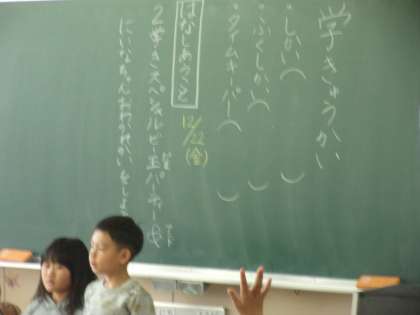 2学期最後の「ビー玉パーティー」の企画をみんなで話し合って決めています。司会、副司会、タイムキーパーも子供たちが行い、話し合いをしています。