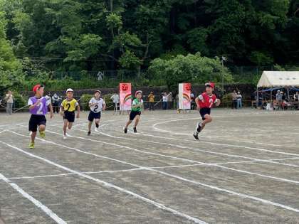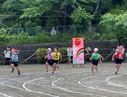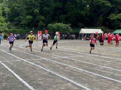 4年生の80m走です。コーナーも上手く走り、ゴールまで駆け抜けました。