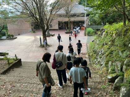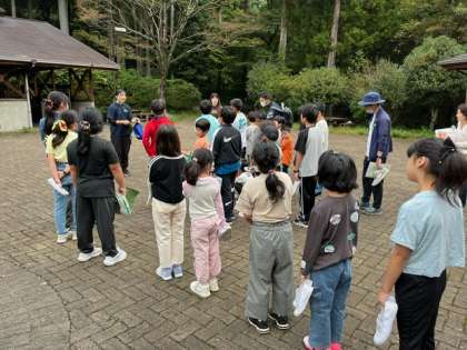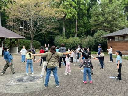 6時半に起床し準備をして、宿舎前の広場で朝の会をしました。朝の会係を中心に健康観察をして、ラジオ体操をしました。その後、新鮮な空気の中で散歩をしました。皆さん元気です。