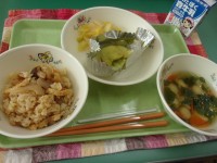 献立名ごまじゃこごはんししゃもの磯辺焼き茎わかめの金平肉じゃが牛乳わかめや茎わか...