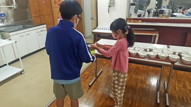 入浴が終わり、夕食の時間です。1年生が、配膳を上手にやっていました。美味しい夕食...