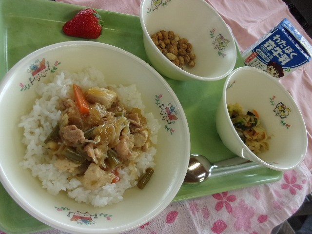 献立名肉豆腐丼豆黒糖野菜のおかか和えいちご牛乳 黒糖は、さとうきび という植物の...