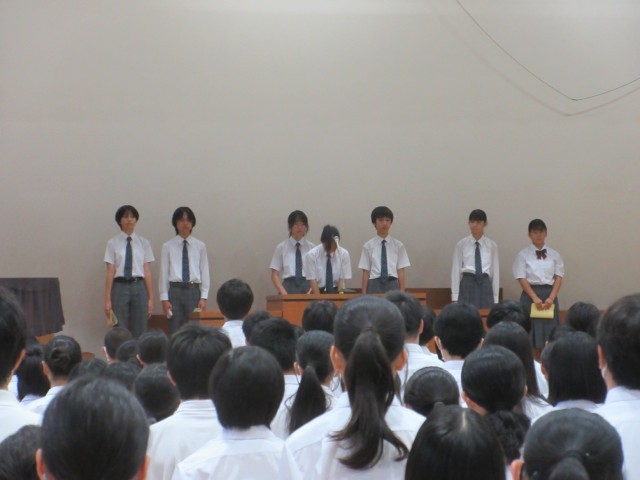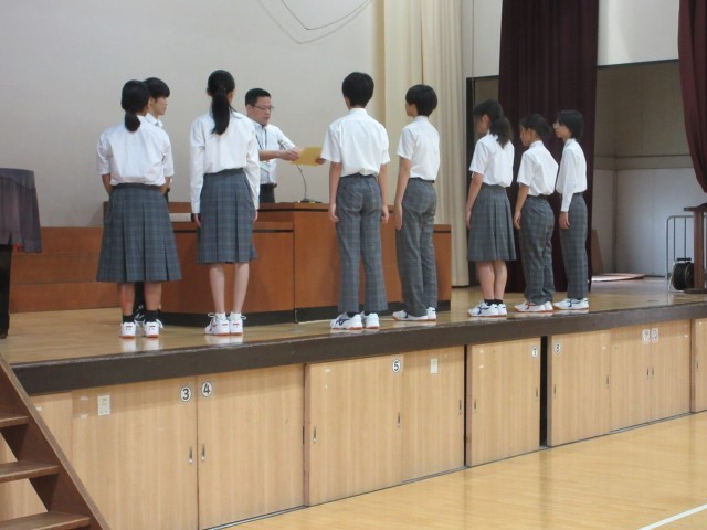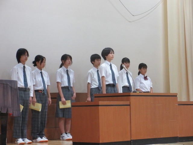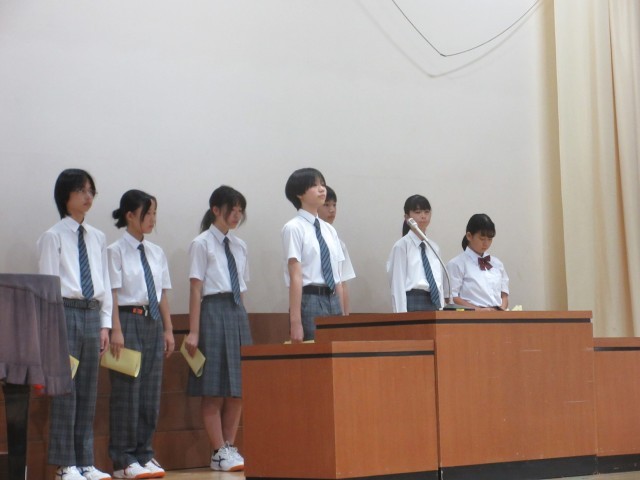 10月6日(月)の生徒会朝礼では、後期生徒会役員の任命式が行われました。校長先生から任命証を受け取ったあと、新役員が壇上で思いや意気込みを発表しました。