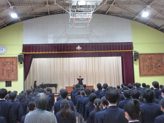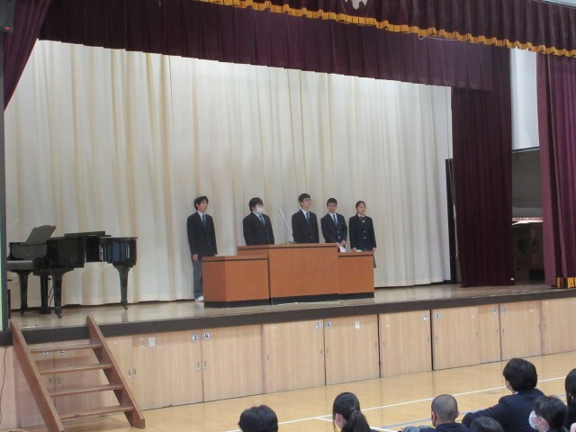 1月8日(木)に3学期の始業式が行われました。代表生徒たちが、3学期の目標や、行事に向けての取り組みを発表しました。校長先生からは、今年の干支や、オリンピック等のスポーツ行事に触れながら、3学期は次につなげる学期でもあるが、その前にまとめをしっかり行ってほしいというお話がありました。3年生は、誇れる上級生として最後までやり切ってほしい。1・2年生は、小さな挑戦を続けることを忘れずに、5組は、行事の成果をその後に生かしてほしい。平常心を大切に飛躍の年に、という言葉で締めくくられました。
