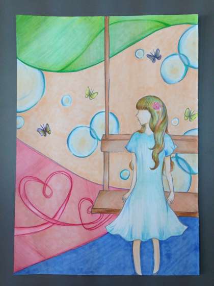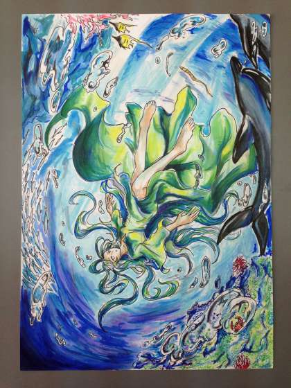 右は、海の中に女の人が落ちていくところが描かれています。