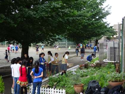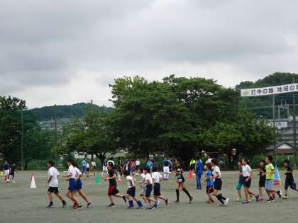 午前中の雨の上がり、校庭やテニスコート、体育館や音楽室で中学生のリードのもと活動を行いました。