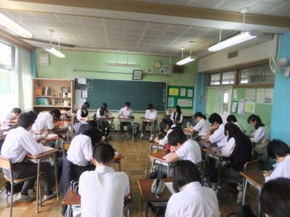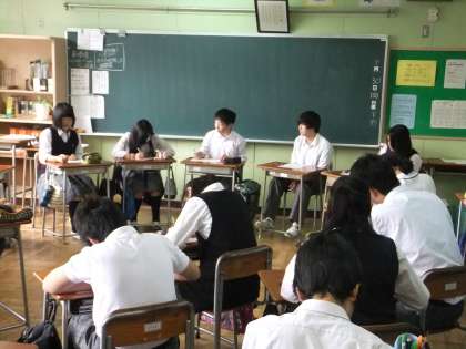 3年生国語科授業で集団討論を行っています。一つのテーマを全員で考え、指名された5名が前に出て討論を行います。その後、良い点、改善すべき点についてクラスで意見を出し合います。