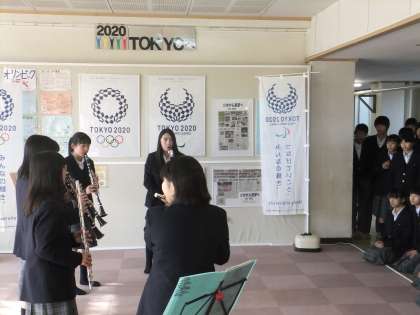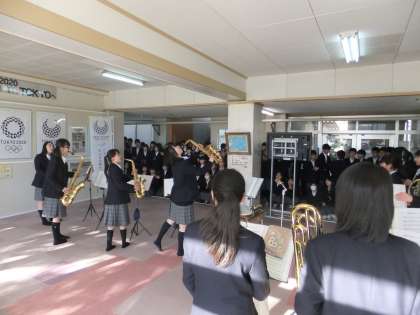 吹奏楽部「Xmas 校内ライブ」 公開日 2016/12/16 更新日 2016/12/16 学校の様子 12月13日〜16日 吹奏楽部が今週4日間、昼休みに各階で「Xmas 校内ライブ」と銘打ったミニアンサンブルライブを行いました。日を追うごとに多くの生徒が集まり、最終日の1階「オリパラコーナー」前での演奏には廊下や階段にクラスメイトを応援する生徒が溢れました。昼休みの校内に温かく、穏やかな空気がながれ、学期末に優しい雰囲気がまた広がったように感じました。 いいね(0)