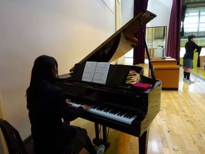 (1)今年の校歌の指揮、伴奏の中田さん、木根淵さんがこの始業式で交代します。全校で拍手で労をねぎらいました。新たな指揮・伴奏者も紹介されました。2年南君、山田さん、町田君