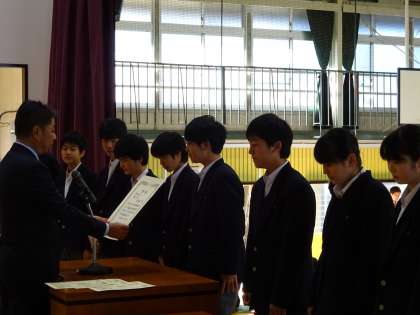 卓球部が市内研修大会に出場し、男子団体7位、女子ダブルス5位、1年男子シングルスで5位に入賞しました。生徒会朝礼で表彰を行いました。