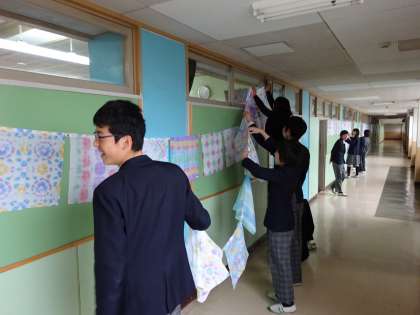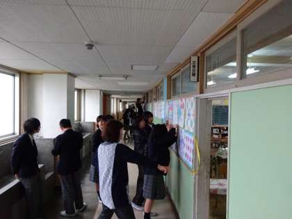 そんな中、すでに進路を決め学校に残っている3年生は打越中初の学習発表会の順にに取り掛かりました。仲間の合否を気にしながらも、力を合わせ教室掲示を行っていました。