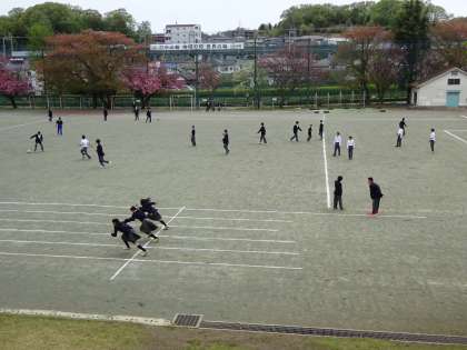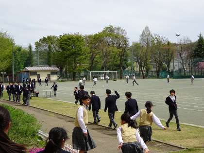 打越中の昼休みの校庭は本当に賑やかです。大勢の生徒が仲間と楽しい時間を過ごします。1年生から3年生、5組の生徒たちの明るい笑い声が響きます。