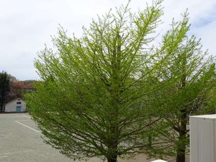 生徒たちを見守る校庭の大銀杏の若葉も日に日に青く大きくなります。