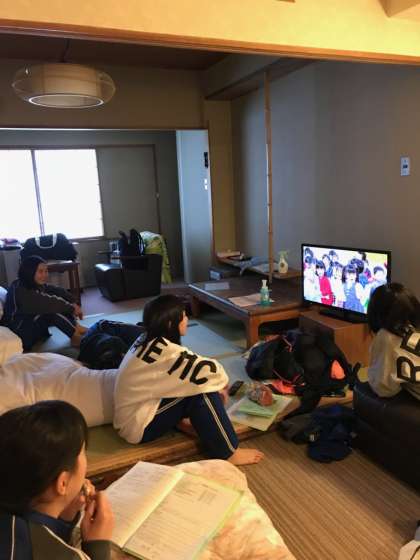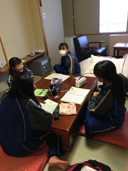 宿舎に戻り、つかの間の自由時間です。しおりに記入しながら、夕食の時間を待ちます。
