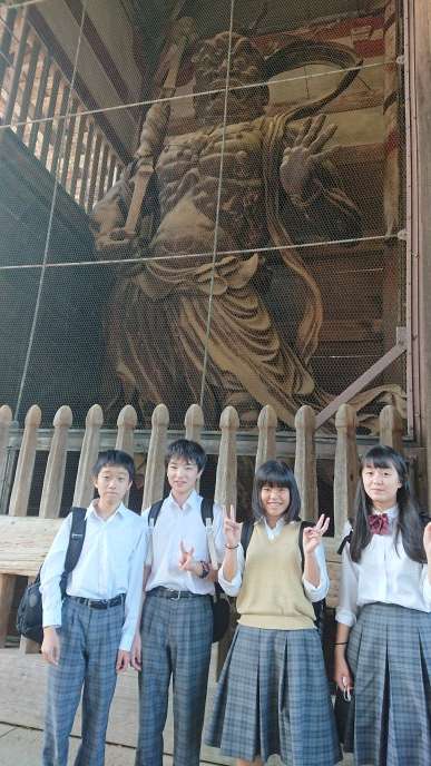東大寺では大仏殿を見て班行動です。爽やかな空気の中で、奈良公園を巡り、鹿と戯れました。