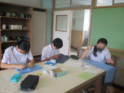 1年生 家庭科 裁縫、集中。