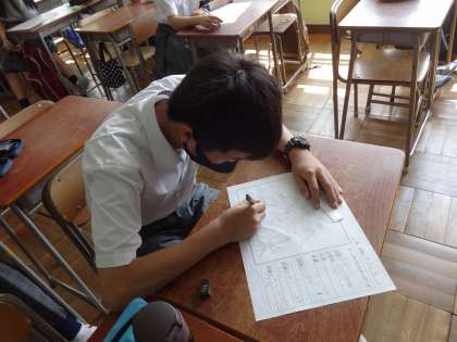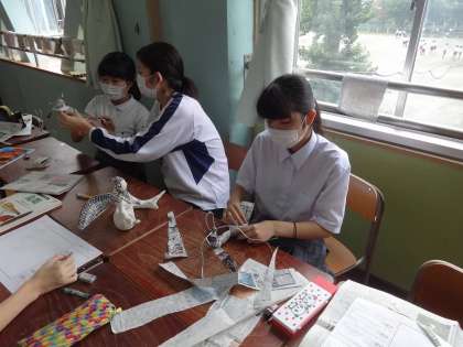 石井先生の美術の授業、今日はテーブルモンスターを作りました。最初に自分の好きなイメージのモンスターを下書きします。次に下書きについて先生の確認を受け、作り方の説明(針金を組み、その周りを新聞紙でくるんでいく)を受けます。一人ひとりが自分のモンスター製作に真剣に取り組んでいました。