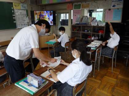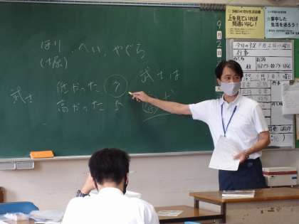 「平安時代の武士の地位って高かったと思いますか?それとも低かったと思いますか?」、先生の問いに5組の生徒の意見は7対5に割れました。