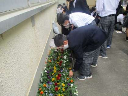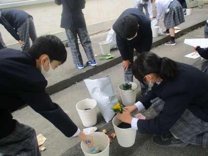 1年技術 春に向けてチューリップとパンジーを植えました。