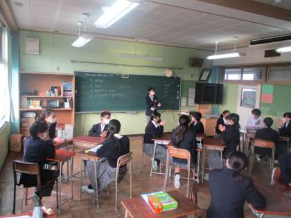 1年英語 英語でゲーム。活動の時は机がダイアモンド型の4人班。
