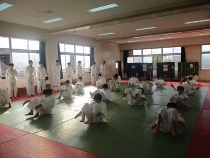 2年体育 柔道。安全のためのよい緊張感の中、頭等を守るコツを学んでいました。