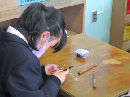 1年美術 消しゴム彫刻。最新の注意を払いながら彫り進めていました。