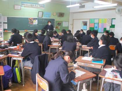 3年社会 ダイアモンド型の机配置で楽しそうに学習。3年間の話し合い活動でコミュニケーション力が高まり、面接練習ではどんな質問をふっても答えられる立派な3年生に育ちました。
