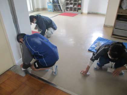 5組 職場実習として古家さんからプロの技を学びながら5組の玄関周辺の清掃作業。今後はペンキ塗りなども予定しています。