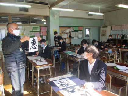 5組書道 上手な作品を皆で見ながら切磋琢磨。