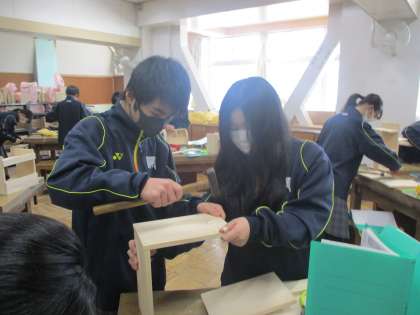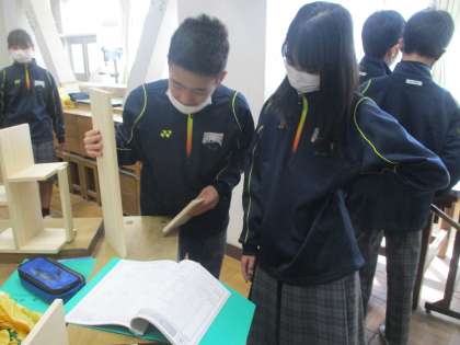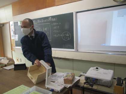 1年技術 ICTで手元の作業内容や注意点をを確認、作業中「組み立て順序が分からない」「支えが必要だ」という時は、ペアやグループで解決しながら作品を完成させていきました。